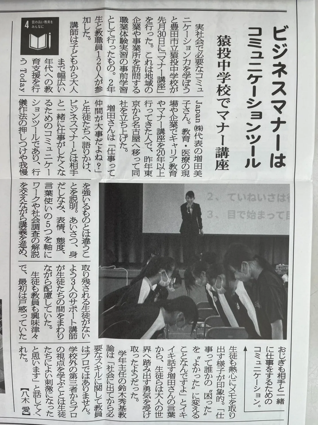 【新聞】全国の学校へ届けたい「マナー=コミュニケーション」出前授業